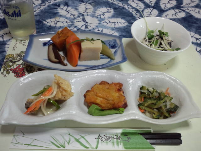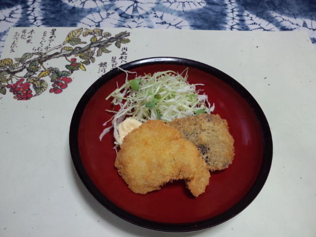 オードブル三品。カイワレとタマネギ・ひじきのシーザーサラダはマジで美味しかったです。白身魚のフライはふかふかでした。