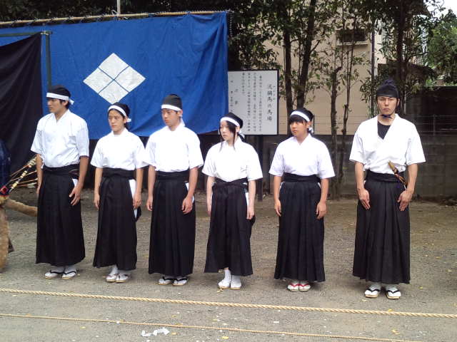 そうしたら何と! 例大祭だとかで、偶然にも流鏑馬神事の時間帯に! ここには神社がありまして、細川氏と縁の深い神社らしいです。入場したのが開始時間丁度だったので、どこだどこだと騒いでいたら、慣れてるのか見かねたのか(きっと後者)、写真屋のおじさんが「馬と人のお清めの儀式があるから、本番はまだ」と教えてくれました。一緒に神事について書かれたプリントもくれました(じーん)。ミナミですれ違ったら怖い感じのおじさんでしたが、いい人でした(お前)。