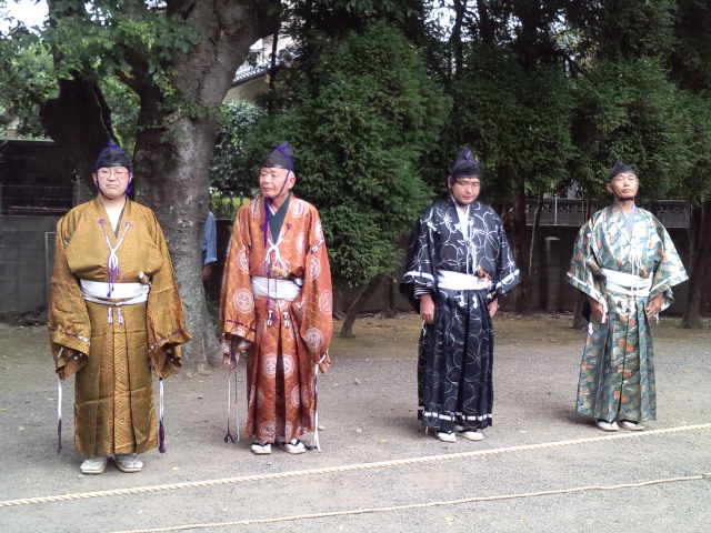 この他、的ごとについて御幣を振って準備が出来た事を伝える「弊振り」と、写ってませんが馬場中央の櫓で太鼓を叩いて開始の合図を送る「太鼓」、次の天長地久式で鏑矢を渡す「介添」がいます。