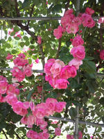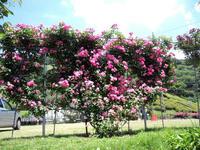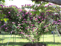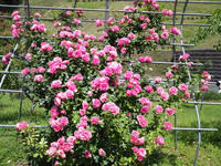 ここは地域おこしの一環として、薔薇を育てているんですが、どこも見事な枝振りと咲きぶりです。特徴は、写真(左:ソニドール、右:アンジェラ)のようにハート型に仕立ててる所です。茂りすぎて分かりづらいですが……。