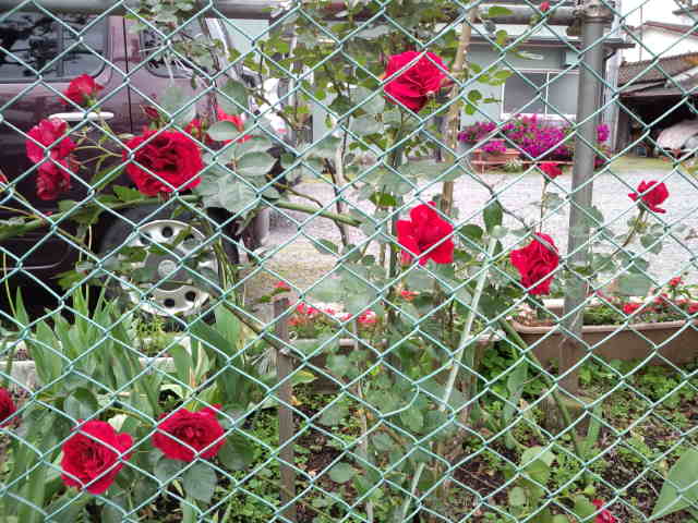 フェンスが邪魔ですが、今年は花壇の薔薇が元気です。因みにこれ、二段構えになっていて、上は沢山つぼみが付いています。これから白バラも咲きます。
